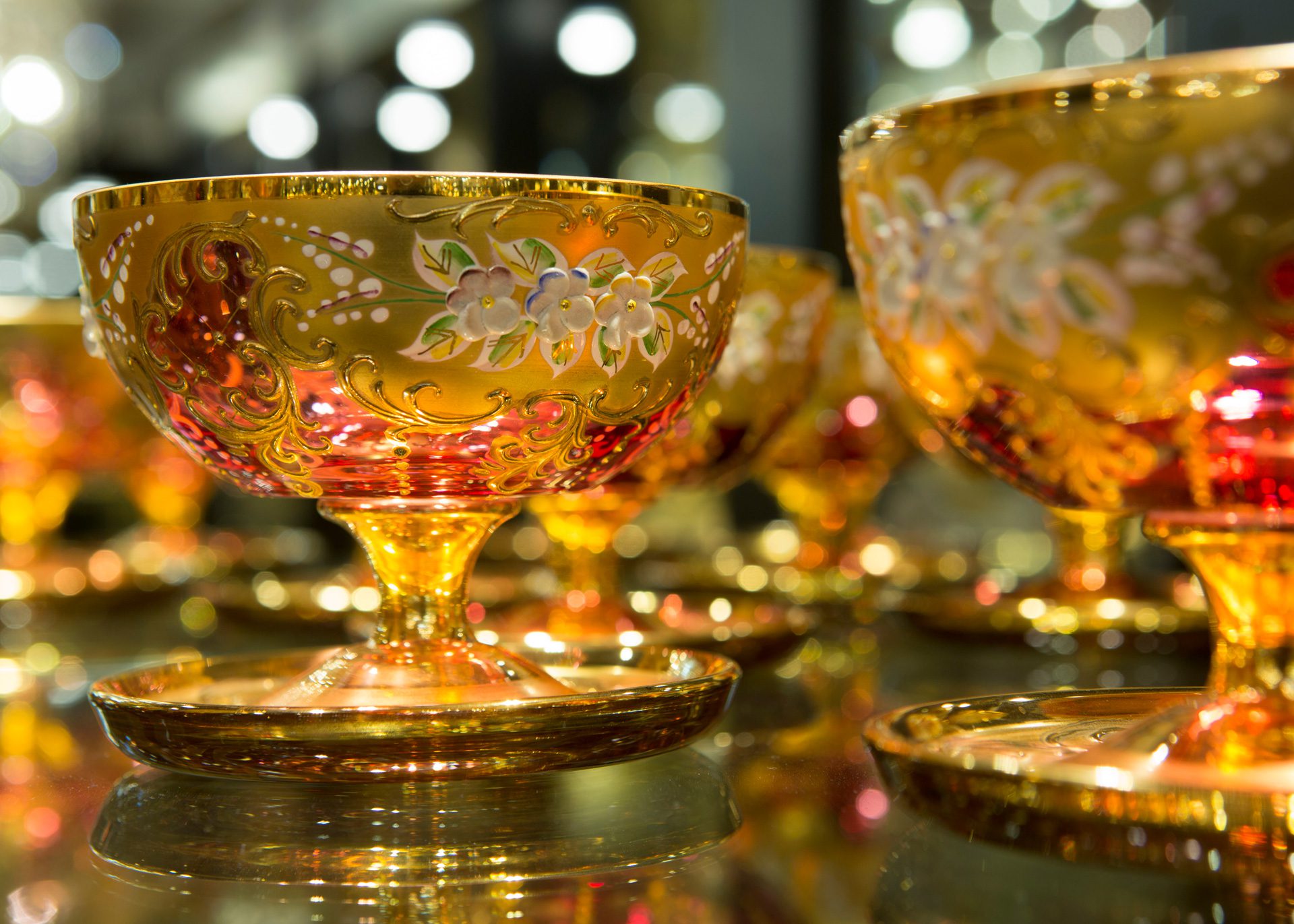 Con l’affinarsi della tecnica della produzione del vetro cristallino, uno dei primi e più antichi impieghi di questo “nuovo” materiale perfettamente trasparente fu la realizzazione di coppe e bottiglie per il vino, bicchieri, tazze, calici, vassoi e piatti.